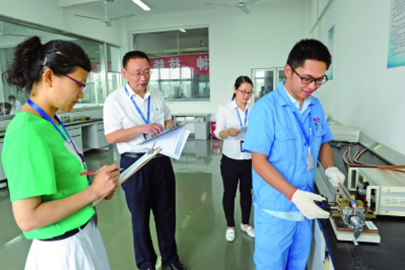 6月20日,DB视讯 电缆第二届职工岗位技能竞赛,在无锡工艺职业技术学院开赛。本次竞赛共设拉丝、绞线、屏蔽、挤塑、检验、叉车及行车等7个科目,参赛职工近百名,将持续至8月底结束。图为由学院老师和公司技术人员组成的考评组,对导体直流电阻检测科目进行现场考核。(宜兴日报)