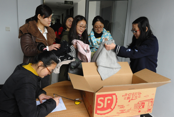 集团公司工作人员为大家、外包装衣服